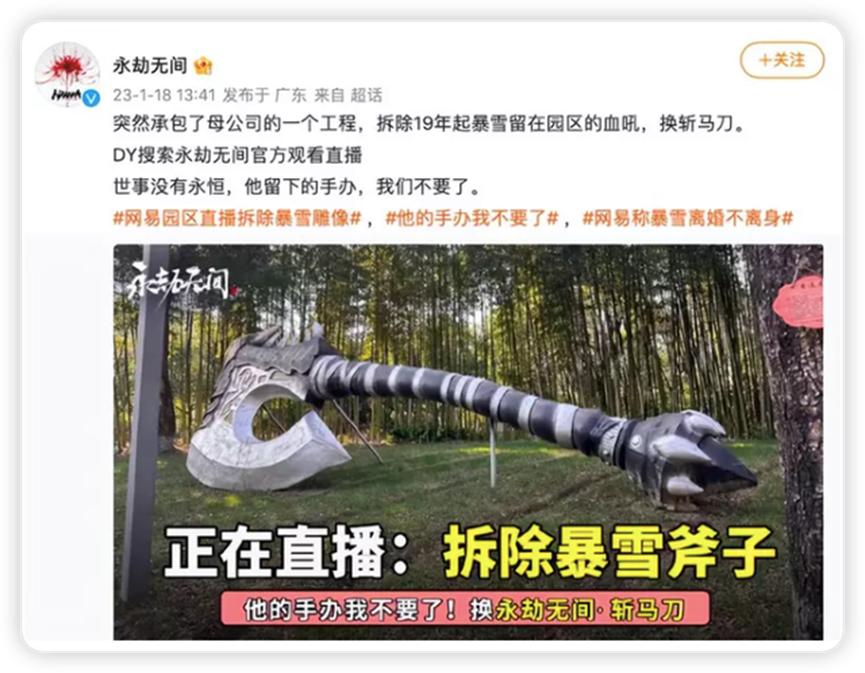 接下来,网易先是推出13(要散)元特饮——“暴雪绿茶”,再就是在《永劫无间》官号上直播拆除暴雪魔兽血吼战斧的雕塑,在宣传效果上都堪称“出圈”。网易的做法,就好比离婚之后立马砸烂当年的定情信物,一时间更坐实了暴雪的“渣男”形象,暴雪进一步陷入负面舆论漩涡。