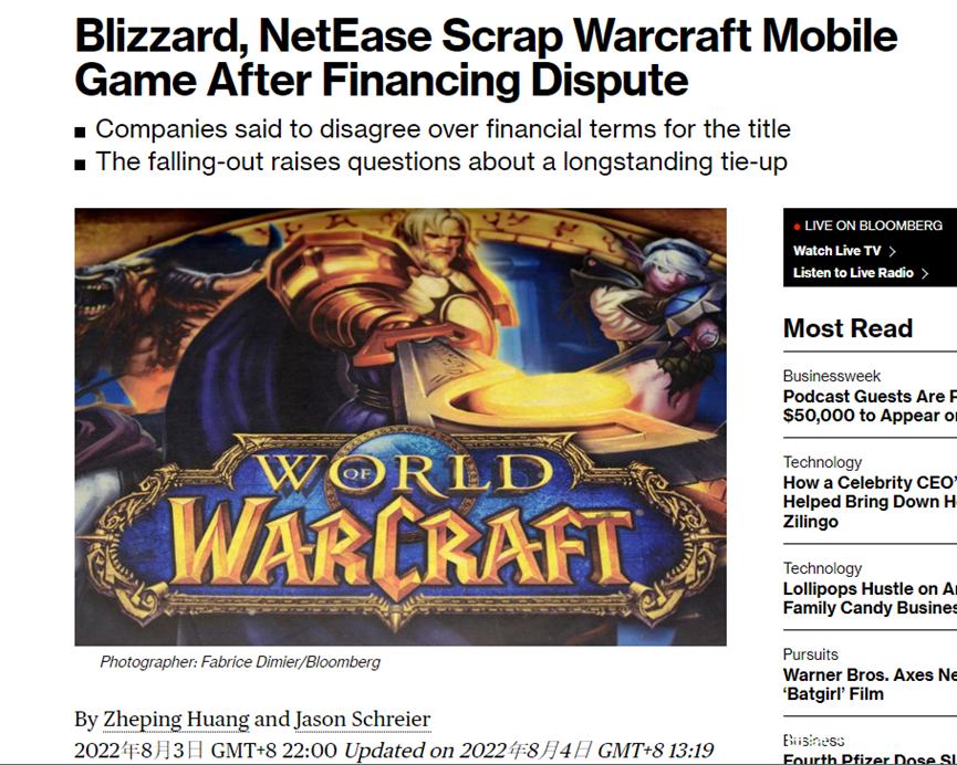 图:据彭博社报道,暴雪与网易合作的《魔兽世界》MMO手游已经中止开发