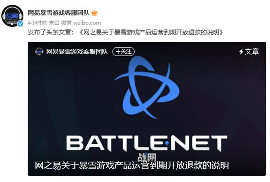 图:网易暴雪游戏客服团队发布《网之易关于暴雪游戏产品运营到期开放退款的说明》