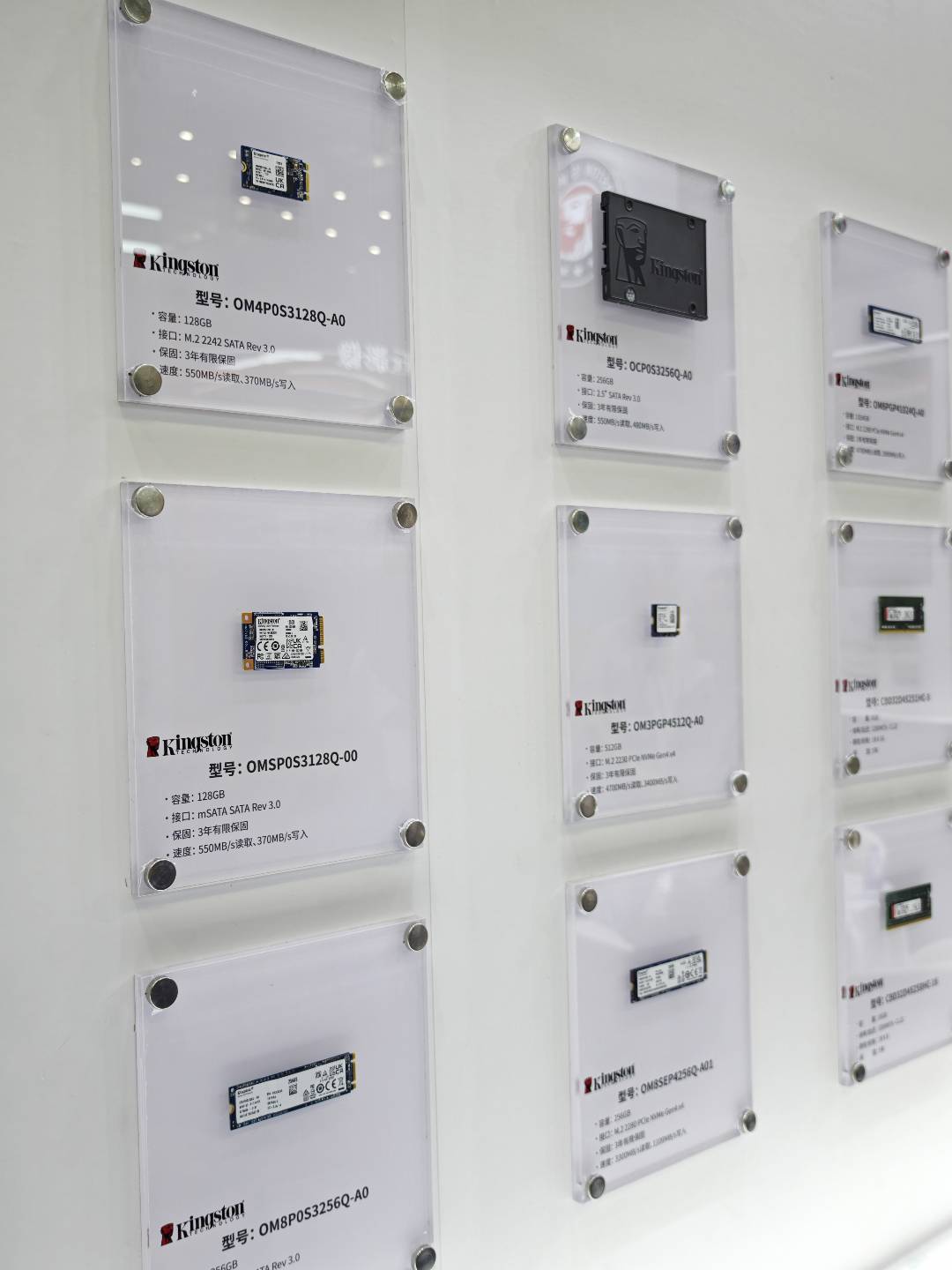 在存储大厂金士顿的展台上,我们看到了他们带来的一系列OEM和企业级存储产品,包括了SSD、内存、服务器内存、企业级固态硬盘和存储卡、SD卡等等。