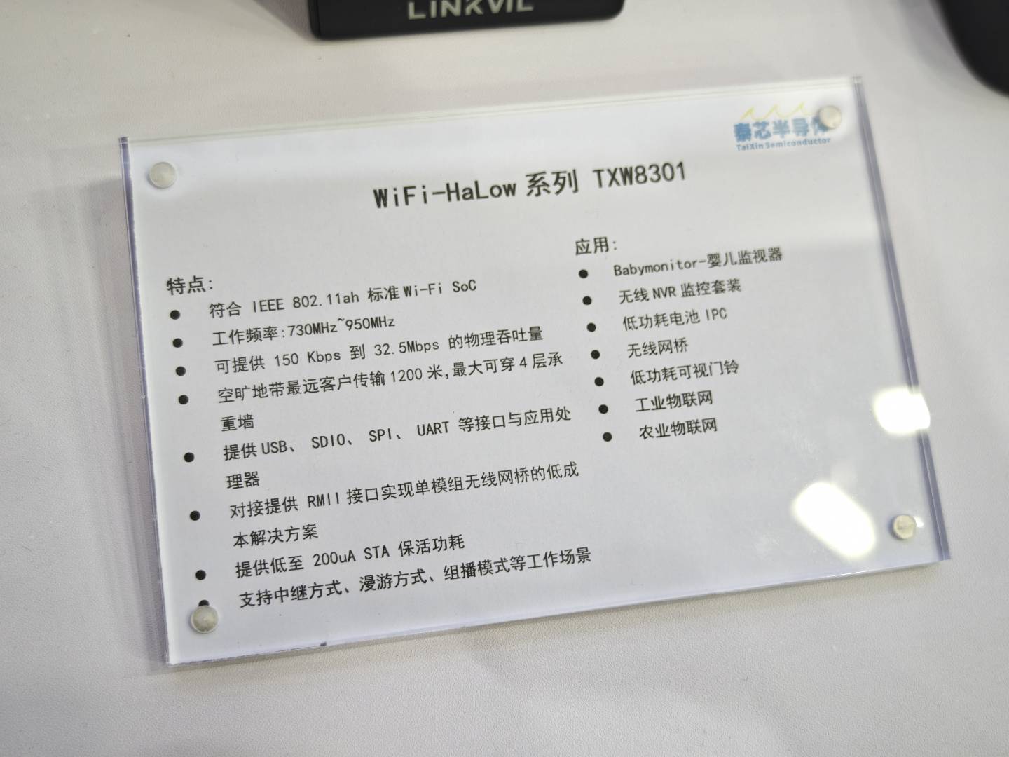 来自珠海的泰芯半导体,带来了自研Wi-Fi HalowTM芯片——TXW8301。该芯片理论上能在距离1公里左右、穿透4层楼板的情况下维持设备连接,连接性远超蓝牙、Zigbee等物联网技术。