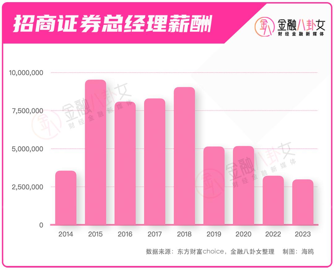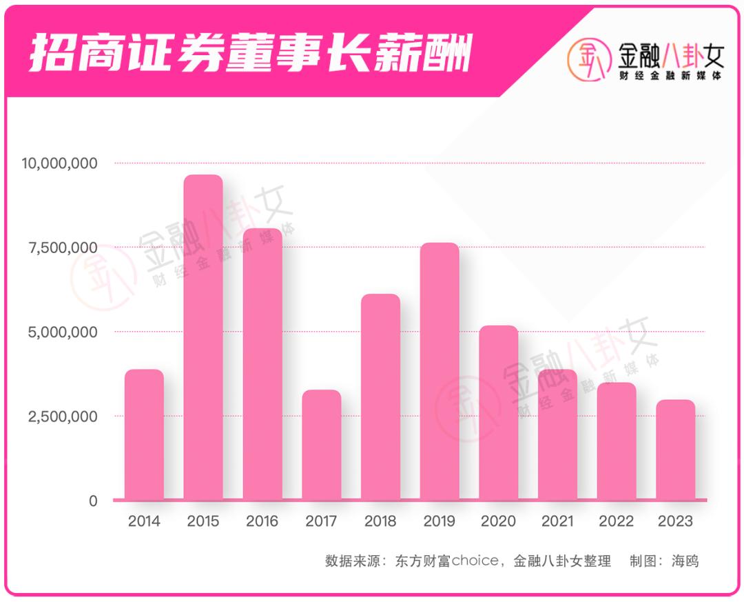 第三名的招商证券,董事长薪酬可是在2015年直逼千万,但是现在只剩298.9万,而且连续五年都是下滑的趋势,看来是降薪贯彻得早。