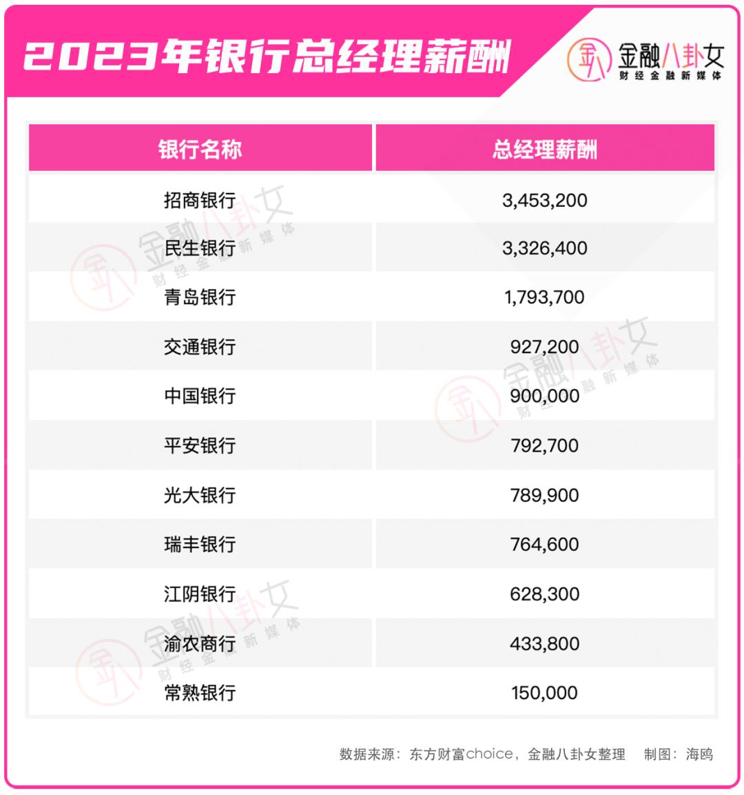 年薪过百万的银行(A股上市)总经理,有4位。其中,招商银行总经理以345万的薪酬高居榜首,民生银行以332万位列第二,青岛银行以179万的高薪位居第三。