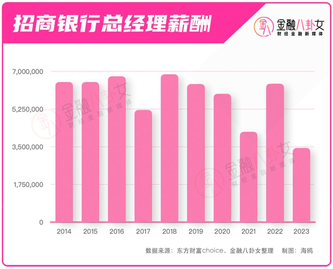 第一名是招商银行,总经理的年薪经历了一次腰斩,2022年的年薪是642.5万,2023年就只剩下345.3万了,在十年内是新低,前面十年可是有7年都是600万+的水平。