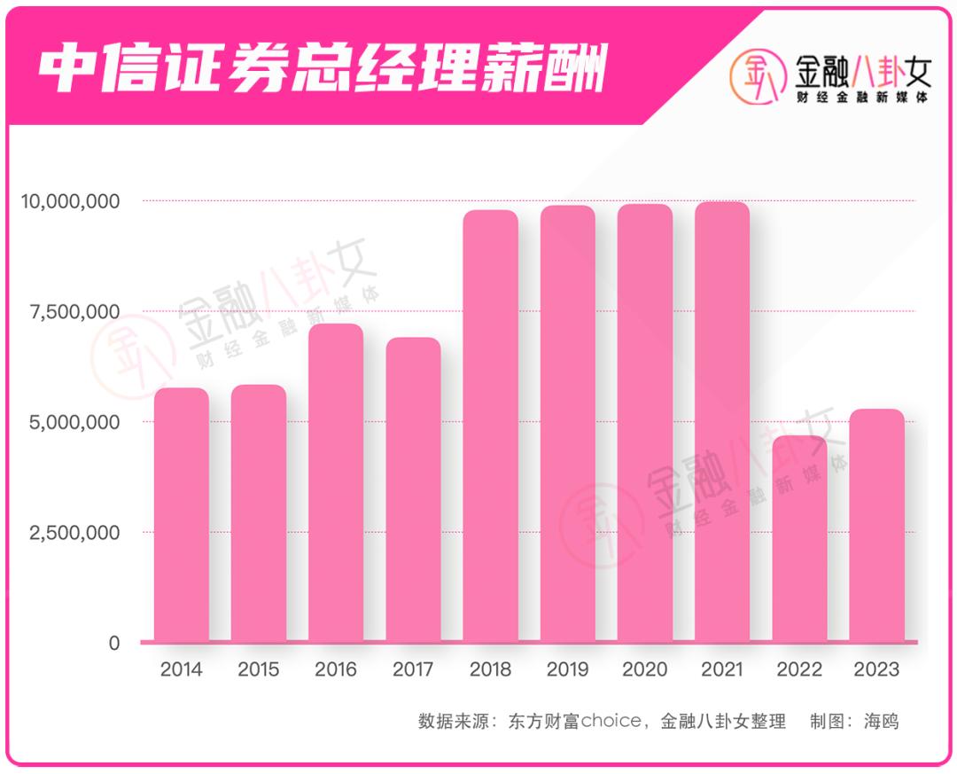第一名又是中信证券,总经理和董事长差不多,都是五百多万的年薪,而且中信证券的总经理,在2018-2021年这四年时间里,年薪直逼千万,最高的2021年达到了998.7万,真·券商一哥就是他了。