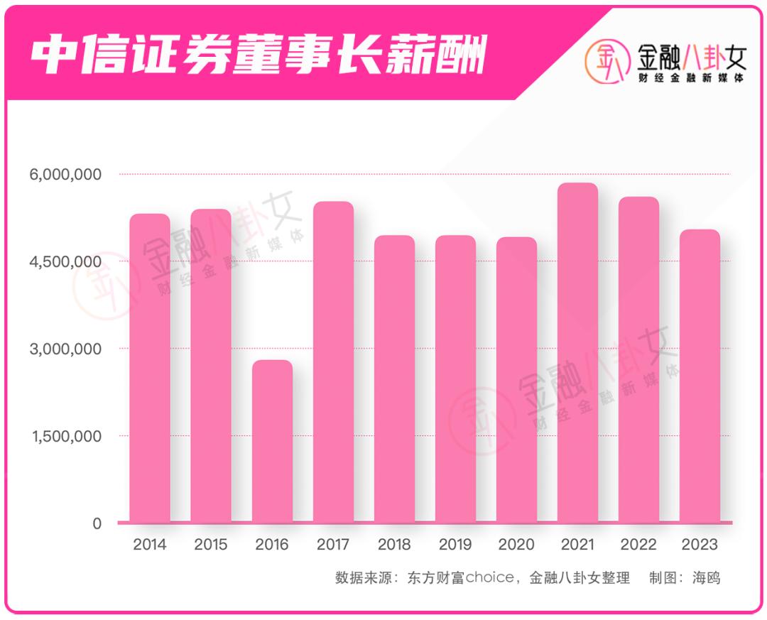 而隔壁券商,简直是秒杀银行,年薪百万以上的有29位,年薪超过300万的有7位,甚至有2位超过500万的都有,分别是中信证券的董事长和总经理,真不愧是敢硬刚交易所的券商,原来在行业里遥遥领先,难怪那么牛:
