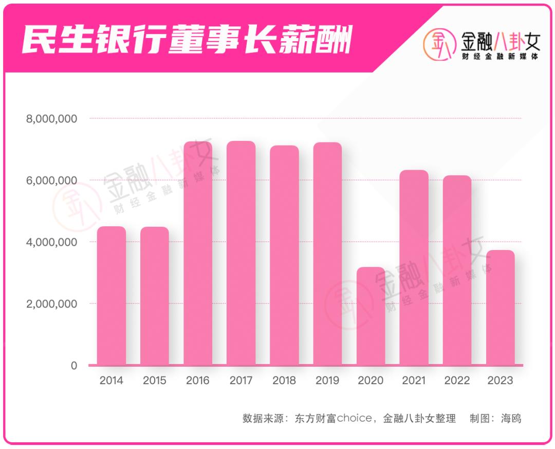 第一名民生银行,今年董事长只拿了去取373.5万,为什么是“只拿了”呢,因为人家在近10年内,有4年年薪超过700万,有2年是600多万,2年是400多万,只有2020年的318.5万比今年低。真的是“好惨”啊,差一点就新低了呢: