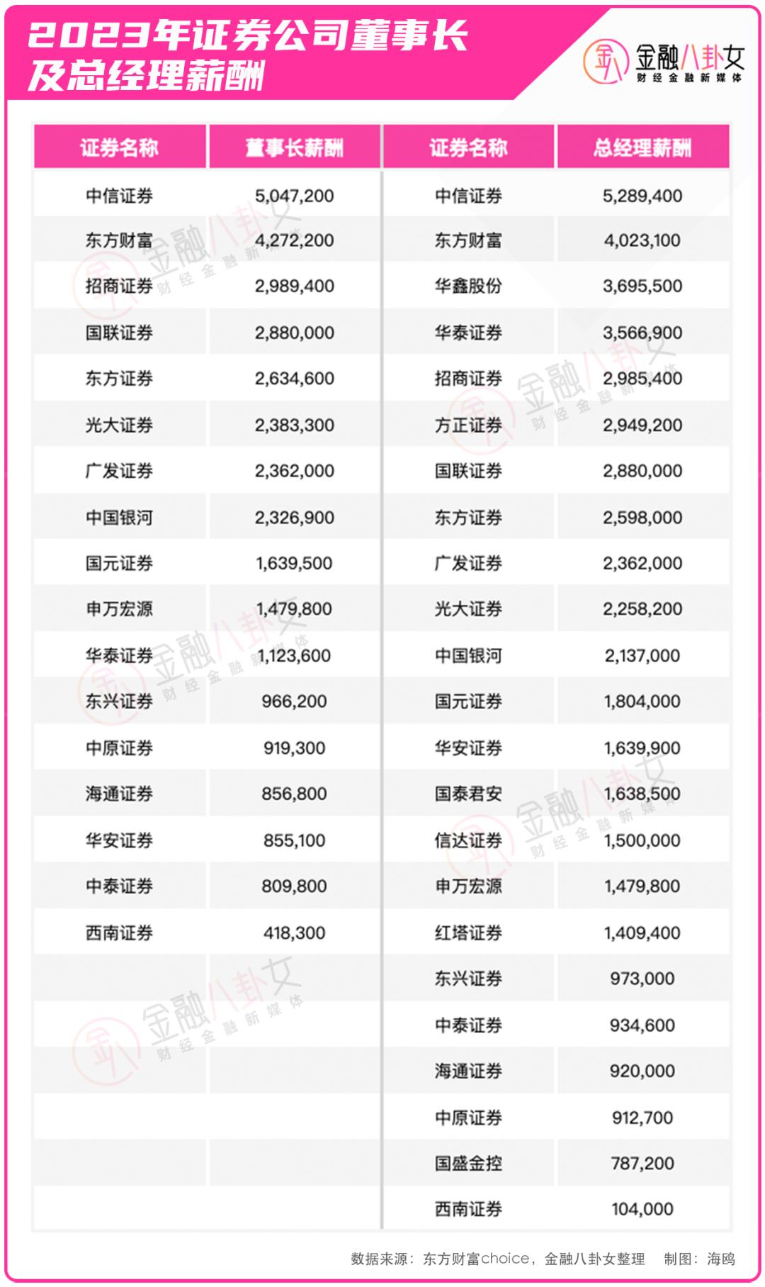 相比之下,高薪的券商真是秒杀银行,董事长年薪上百万的就有11家,前五名如下: