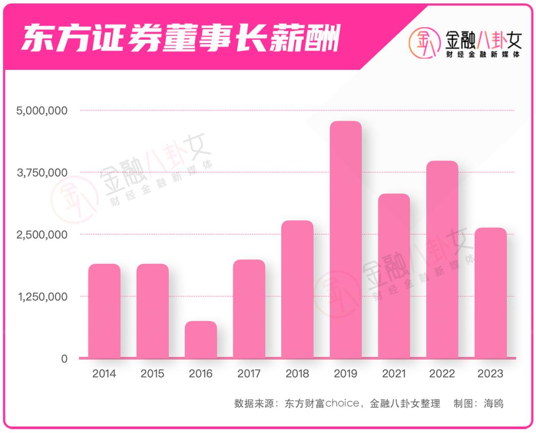 第五名的东方证券,董事长薪酬可是大起大落了,最低在2016年只有75万,最高的2019年拿了478.4万,差了六倍多。