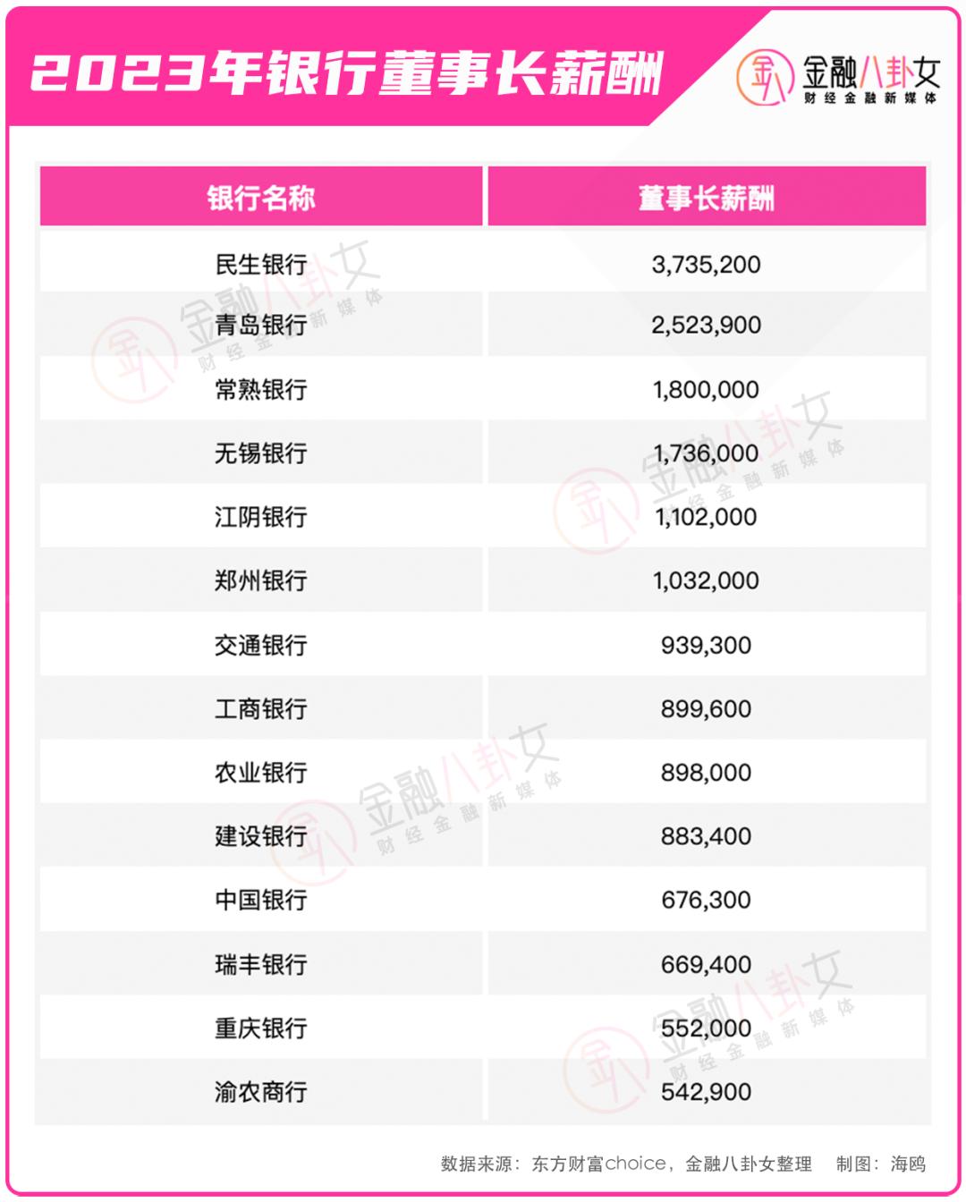 年薪过百万的银行(A股上市)董事长,有7位。而工农中建交这五家,董事长年薪都没有到百万,排名第一的是民生银行董事长,年薪373万;紧随其后的是青岛银行,252万;常熟银行董事长以180万也高居第三名。
