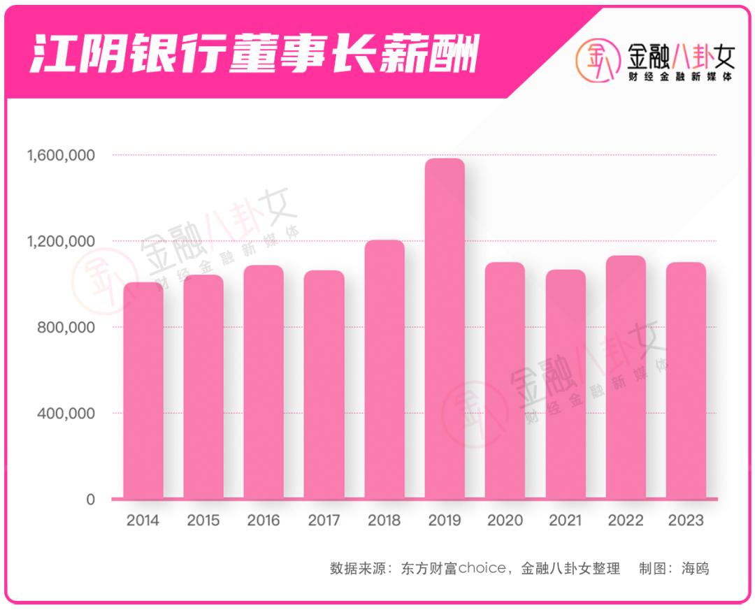 第五名的江阴银行,董事长年薪在近十年多数时候,是100万-110万之间,只有2019年突然一枝独秀拿了158.2万。