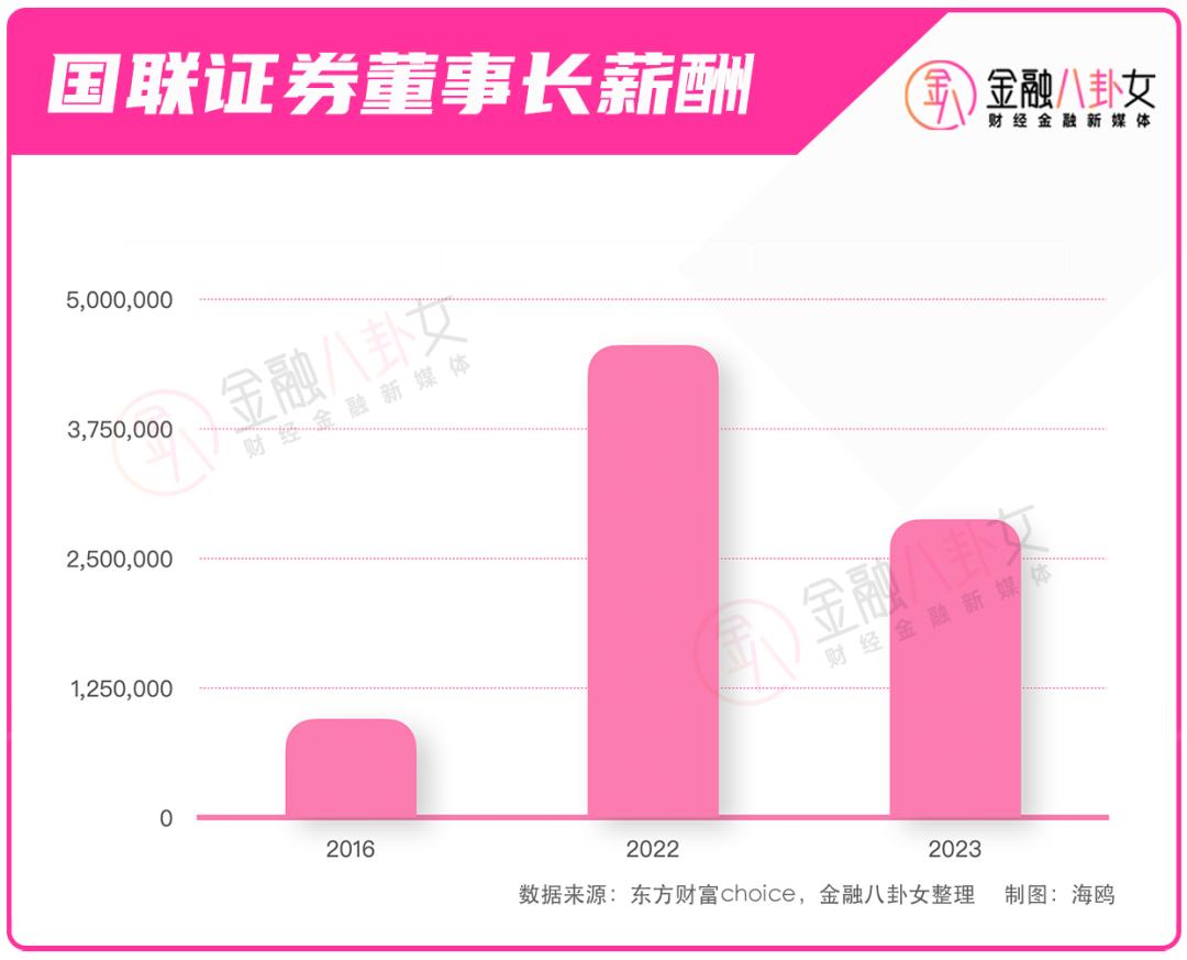 第四名的国联证券董事长年薪只有三年的数据,分别是2016年和近两年的,2022年还拿了456万,2023年只剩下288万了。