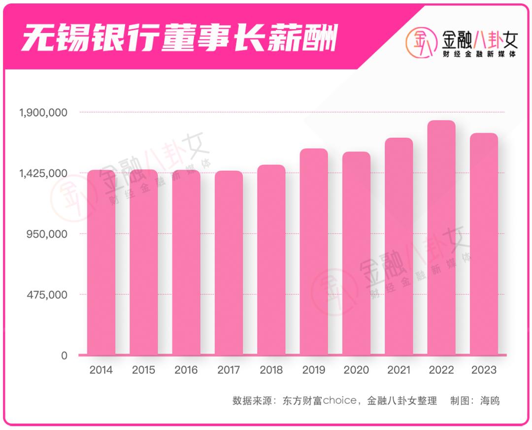 第四名的无锡银行, 2023年的董事长薪酬比2022年降了10万,从183.7万降到了173.6万,但可以说变化一直都不大,大部分年份就是10万以内的波动。