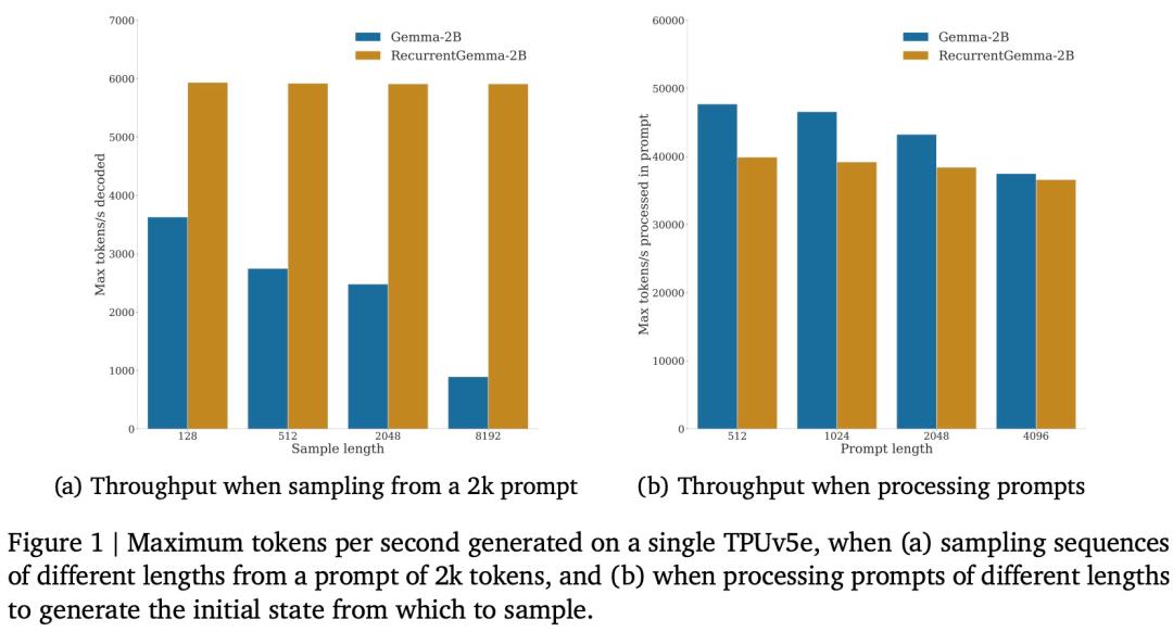 同时,RecurrentGemma-2B 在推理过程中实现了更高的吞吐量,尤其是在长序列上。