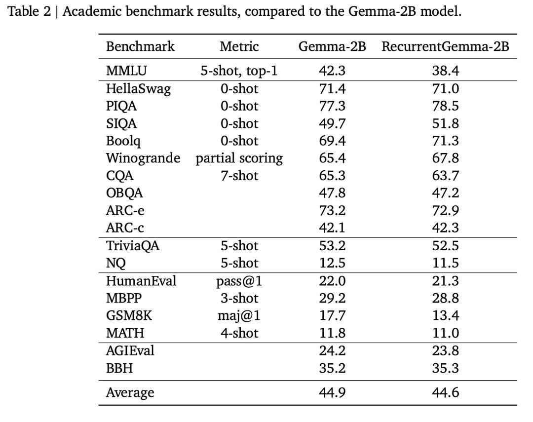 RecurrentGemma-2B 在下游任务上实现了卓越的性能,可与 Gemma-2B(transformer 架构)媲美。