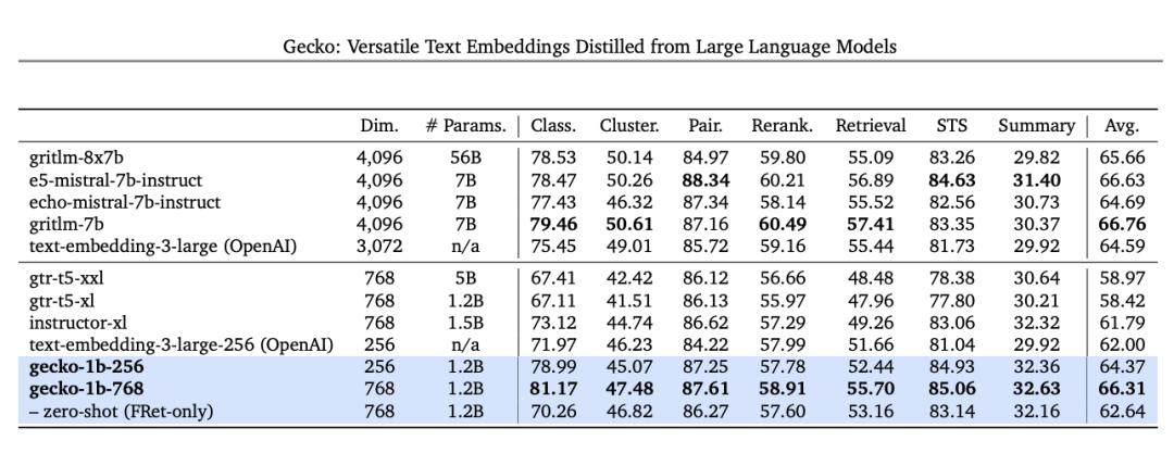 在 MTEB 基准测试中,使用 256 dims 输出的 Text-embedding-004(又名 Gecko)优于所有较大的 768 dims 输出模型