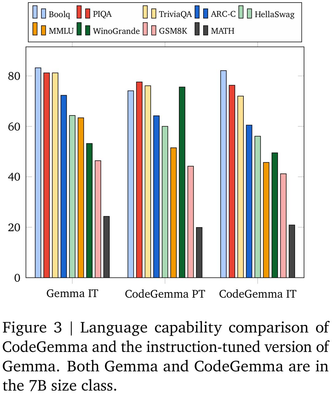 CodeGemma 7B 模型与 Gemma 7B 模型在 GSM8K、MATH 等数据集上的比较结果。