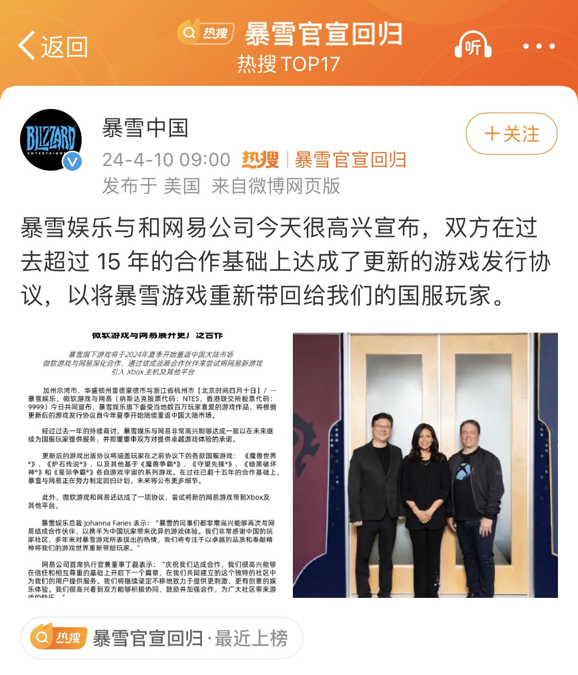 4月9日,一张丁磊与暴雪新任CEO约翰娜会面的照片在网络上广为传播,引发大量玩家猜测。一天后,靴子正式落地。