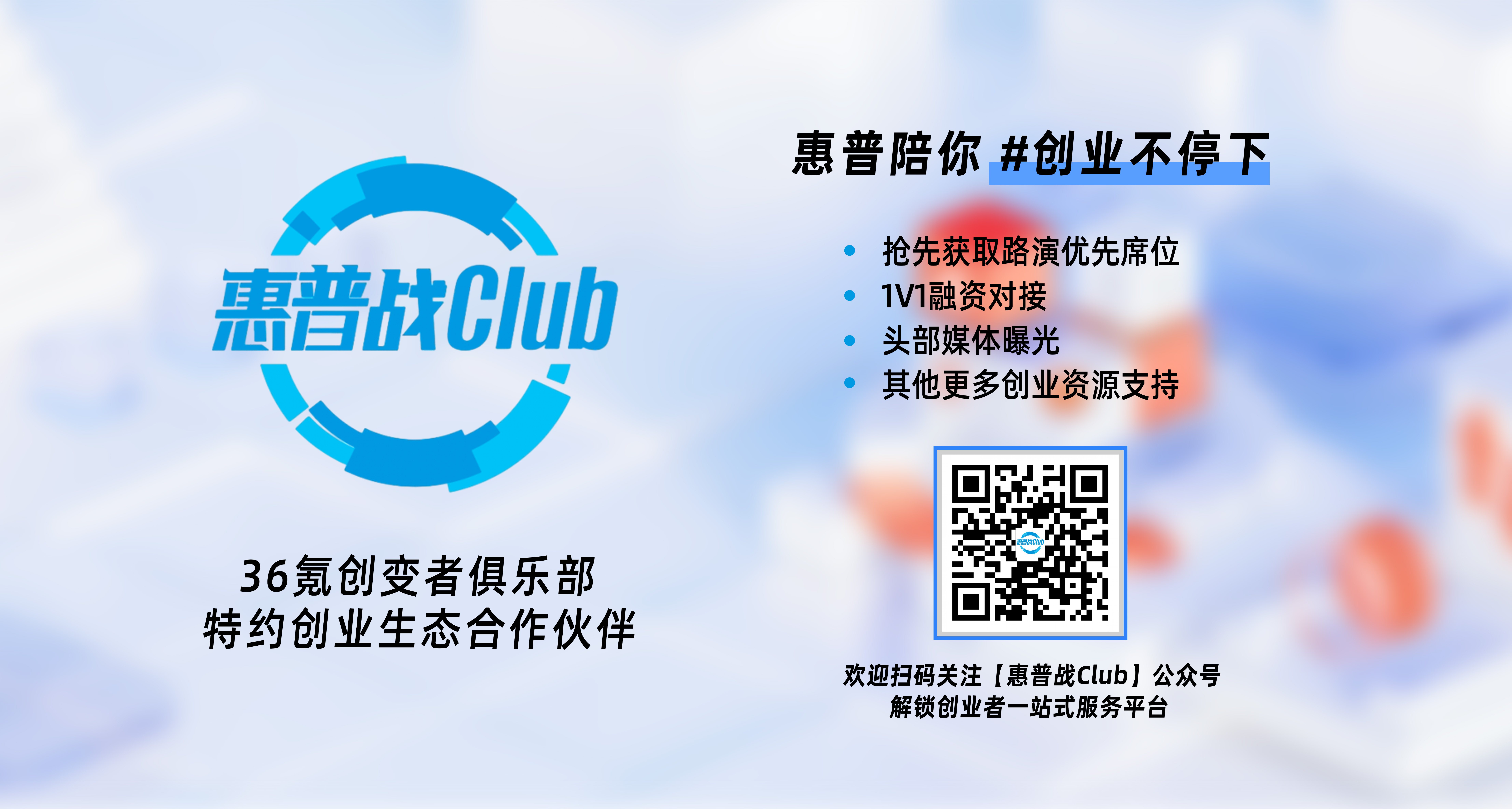 本场路演由36氪创变者俱乐部特约创业生态合作伙伴——惠普战Club特别支持。惠普战Club作为创业者的得力助手,为创业者提供全面的一站式服务,从丰富的创投资源到IT支持,全方位助力初创企业成长。