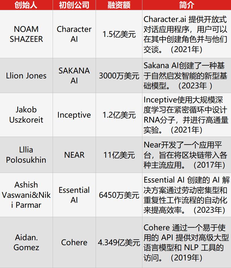 距2017年论文《Attention is All you need》横空出世不到 7年,Transformer团队里8个人有7个都自立门户开始创业了,凭借自己的技术背景,获得了价值不菲的融资额。