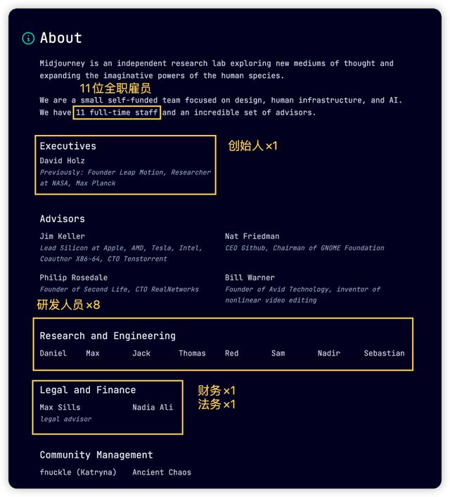 极少数天才的价值,在AI产品端也得到了最大程度地放大。年营收1亿美元的Midjourney仅11名全职员工,其中甚至还有4个本科在读,背后的核心研发团队仅8人。值得注意的是,这家公司甚至没有高额的融资背景,几乎是白手起家。