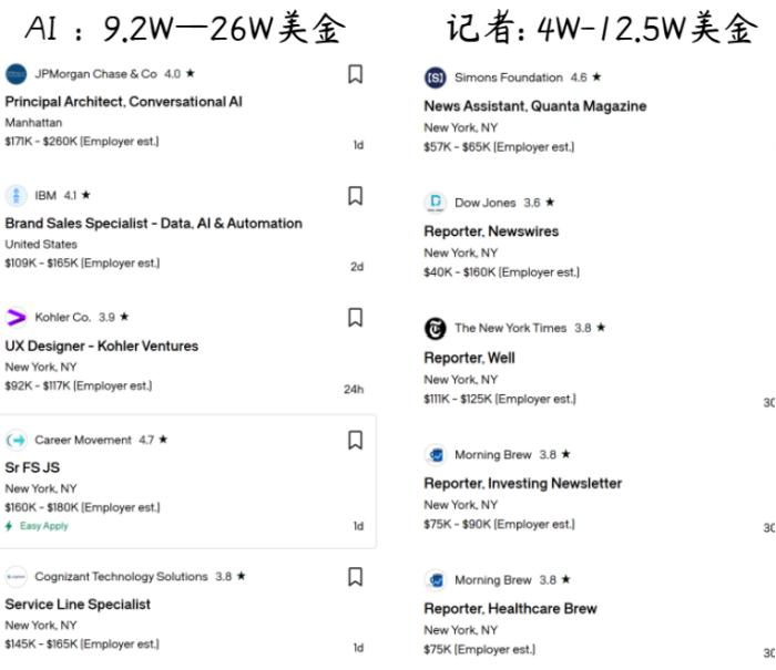 从美国招聘网站以Glassdoor为关键词进行检索,可以看见,大部分AI工作的年薪都在15万美元左右(折合人民币约109万)。作为对比,我们以reporter(记者)为关键词继续检索,发现最新的招聘信息里记者的薪酬大概在10万美元以下,相当于AI工资水平的食物链底部。