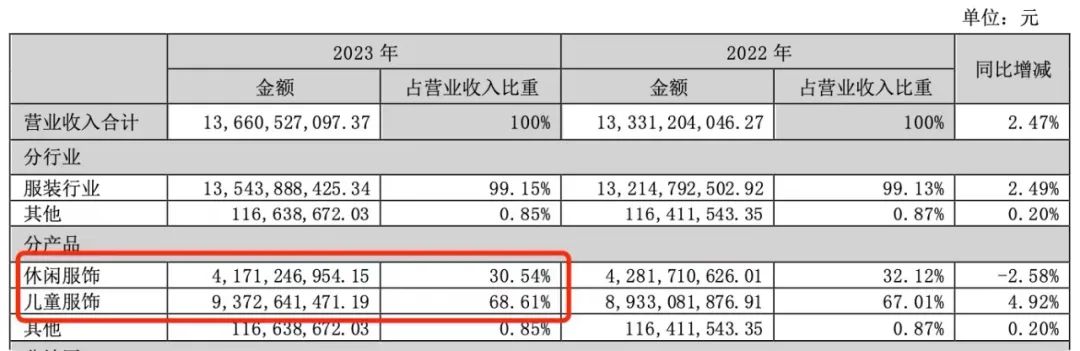从产品营收来看,童装产品撑起了森马营收大头。2023年,森马儿童服饰营收93.73亿元,同比增长4.92%,占营业收入的68.61%;休闲服饰收入41.71亿元,同比下降2.58%,占营业收入的30.54%。
