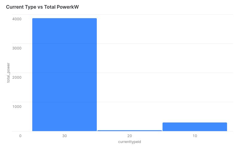 SELECT sum ("powerkw") as "total_power","currenttypeid" FROM ev_table where "currenttypeid" > 1 GROUP BY "currenttypeid" ORDER BY "currenttypeid" ;