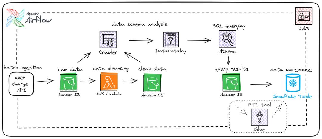 问题陈述:分析电动汽车充电基础设施以识别任何模式并提出改进建议。数据源: Open Charge API数据编排: Airflow数据湖: AWS S3 存储数据架构理解: AWS Glue Crawler and Data Catalog数据清理和预处理: AWS LambdaETL 和探索工具: AWS Glue 和 Athena数据仓库和仪表板: Snowflake数据安全:IAM