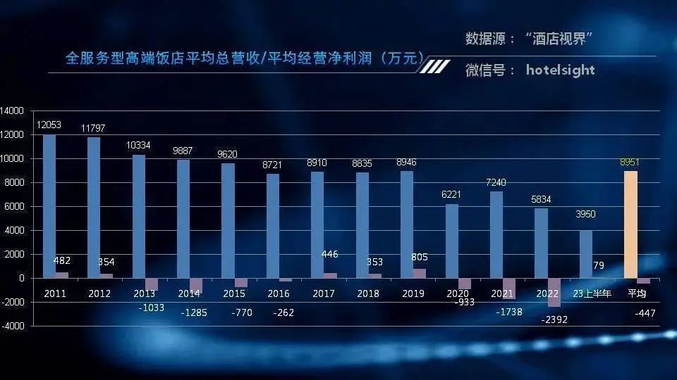 不过,随着政府会议市场细分领域开始萎缩,国内全服务商务酒店进入下行周期,其一方面表现为营收持续下降,投资回报低下。根据和泰盛典发布的全服务型饭店经营数据统计报告,自2013年以来,全服务型高端酒店平均总营收和平均经营净利润一直处于下降通道中,2023年上半年全服务高端酒店平均总营收接近4000万元,对比2011年的12053万元已有了大幅缩减,同时酒店的平均净利润很低。2024年开年全服务型酒店走势平淡,平均总营收额、平均出租率依然处于下降趋势。