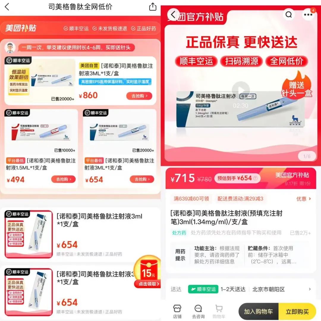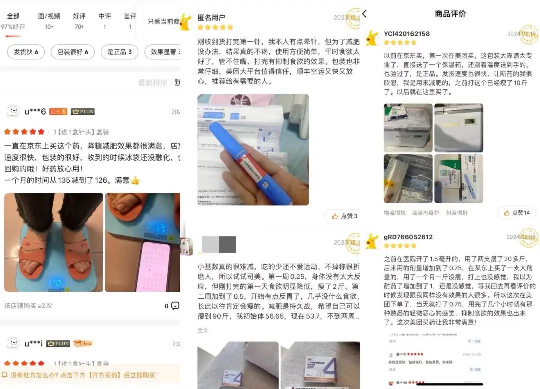 狂热的需求下,司美格鲁肽自然也就成为了各大互联网卖药平台不可放弃的“明星单品”,美团、饿了么、京东、阿里等互联网买药平台掀起了一场争夺“减肥生意”的盛宴:美团买药打出“美团官方补贴”来吸引用户;饿了么买药上,也有部分司美格鲁肽产品标有“单品特价”。多家线上药店售卖的司美格鲁肽销量已超过一万单,有的甚至超过10万单。一些平台的商品评论区,也不乏“用了司美格鲁肽后减掉了XX斤”类似的评论。