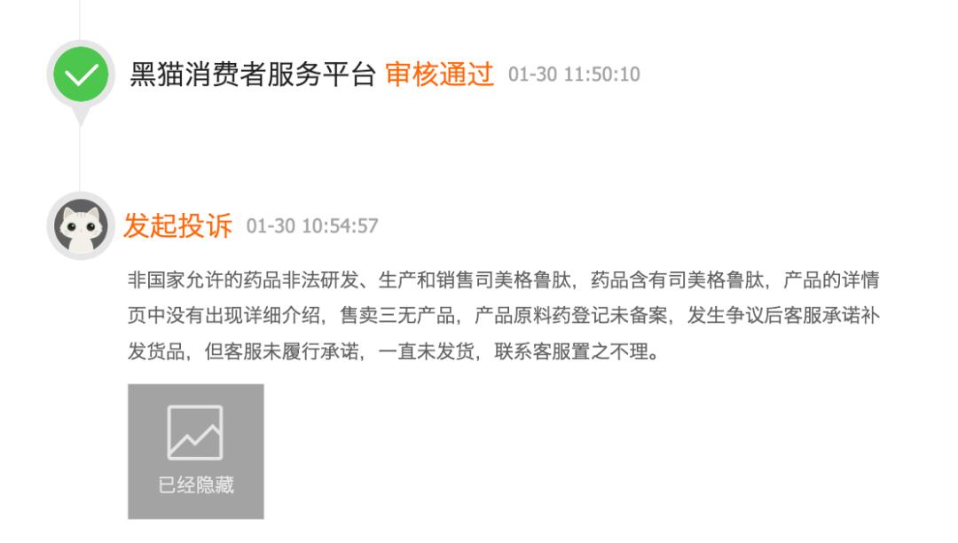 但是对平台而言,销售司美格鲁肽,同样存在隐患。黑猫投诉上,有不少用户投诉,在网上买到的司美格鲁肽是假药。一位用户对在美团某大药房上购买的司美格鲁肽发起投诉,称扫药品追溯码的时候发现被多人验证过;还有用户称在京东上买的司美格鲁肽,产品的详情页中没有出现详细介绍,产品原料药登记未备案。