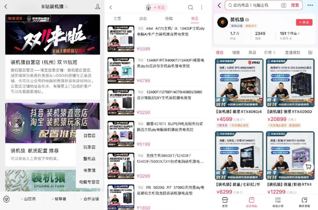 淘宝店铺还分为装机猿自营店、装机猿电竞馆、装机猿玩家店等细分矩阵店铺。