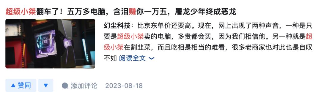 然而去年 8 月, @超级小桀和朋友合作开了一家电脑装机店,结果极低的性价比,和“5 万元配置单”的割韭菜套装,让他被粉丝怒喷。