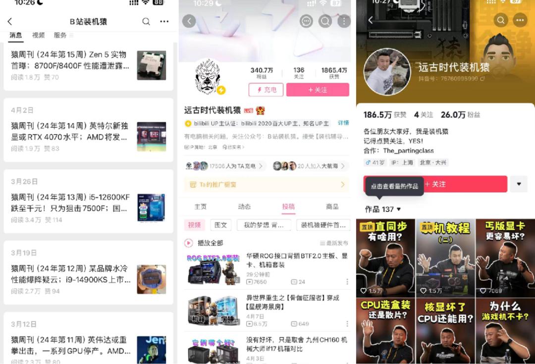 @远古时代装机猿的内容生态布局非常早,目前已经较为完善,在公众号、B站、抖音都有自己的内容输出矩阵,累计粉丝 500 万+。
