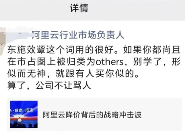 指名道姓,对家也看在眼里。一位阿里云高层事后在朋友圈点评了此事,称其为“东施效颦”:别学了,没人买。