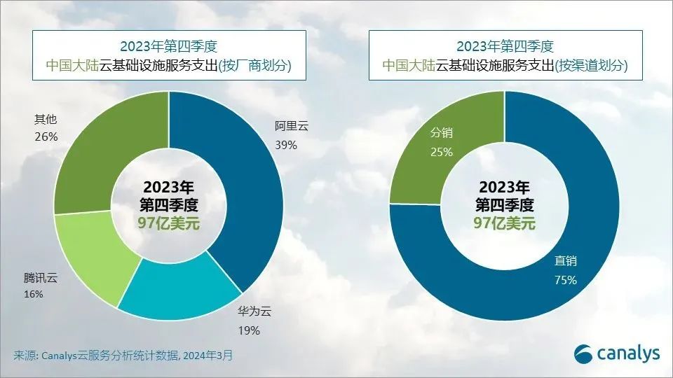 在市场份额方面,根据Canalys的数据,2023年内的阿里云继续保持着国内云服务赛道的领先地位,2023年第4季度市场份额达到39%,但同比增长放缓至仅3%。华为云以19%的市场份额位居第二,同比增长率为23%,正逐步缩小着与阿里云之间的差距。