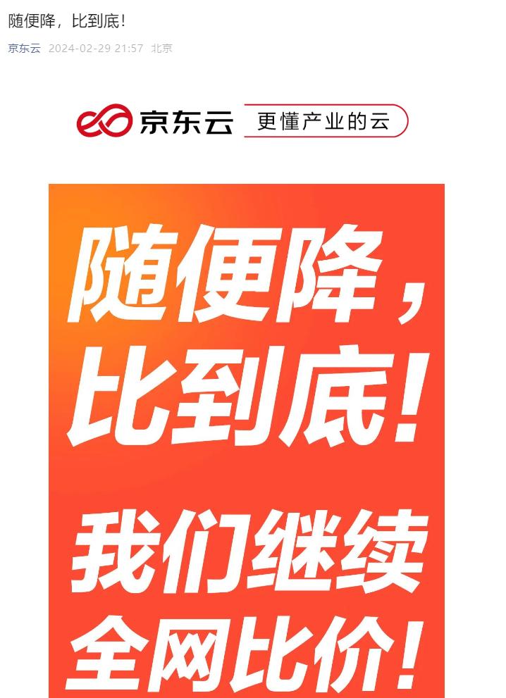 巧了,京东云也是这么想的:在阿里云官宣降价的同天晚上,京东云官号发布了这条仅含一张图的推送,明牌对标阿里云。