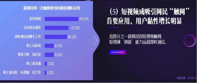 值得注意的是,近四分之一新网民因短视频触网,短视频“纳新”能力远超即时通信。 新入网的网民中,24.3%的人第一次上网时使用的是短视频应用。