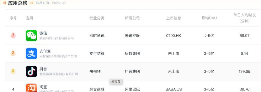 另外,QuestMobile数据显示,截至2022年9月用户在抖音、快手、微信的人均单日使用时长分别为108.4分钟、102.3分钟、97分钟,而据月狐2024年2月份的的数据,微信单日人均时长只有69.97分钟,而抖音高达139分钟。