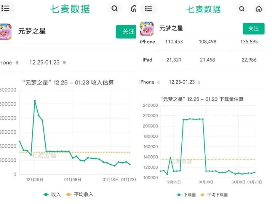 上线初期,《元梦之星》靠买量,霸屏几乎所有主流APP,但在投放下降后,各项数据也在迅速走低,七麦数据显示,上线近一个月来,《元梦之星》下载量、预估收入等核心数据,均在短暂高峰后出现断崖式下滑,大幅落后《蛋仔派对》。