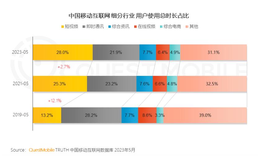 从月狐与QuestMobile的数据来看,在过去几年即时通讯用户时长已经被大幅挤压的情况下,即使视频号时长已经有所增长的情况下,今天即时通讯总的用户时长占比21.4%,相比2023年5月份的数据依然在下滑。