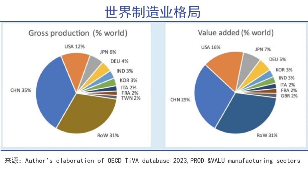 2023年,中国制造业总产值占全球35%,超过第2-10名的总和;经济附加值占29%,超过第2-4名的总和。