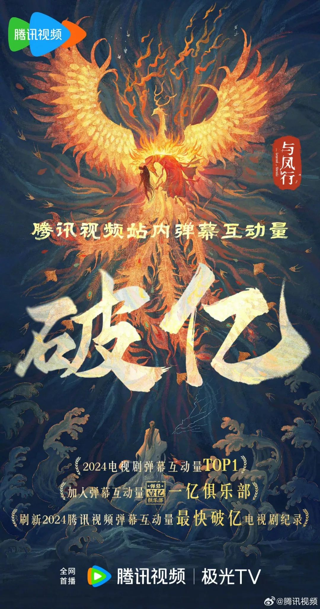 同时,在弹幕互动量上,《与凤行》稳居2024电视剧弹幕互动量TOP1,加入弹幕互动量1亿俱乐部,刷新2024腾讯视频弹幕互动量最快破亿电视剧记录。