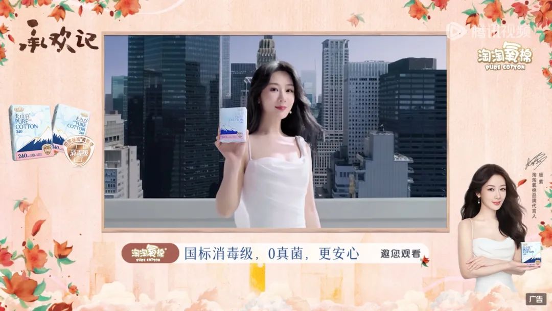 同样地,在电视剧《承欢记》的广告金主中,杨紫作为淘淘氧棉品牌代言人,淘淘氧棉便成为了该剧的合作伙伴。