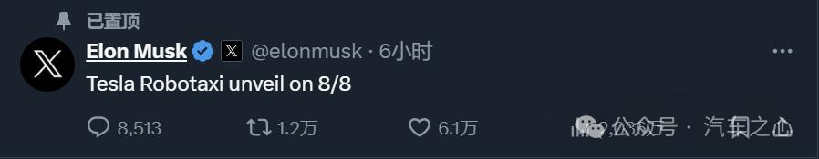 4 月 5 日,马斯克置顶贴文:「Tesla Robotaxi unveil on 8/8」 (特斯拉将在 8 月 8 日推出机器人出租车) 。