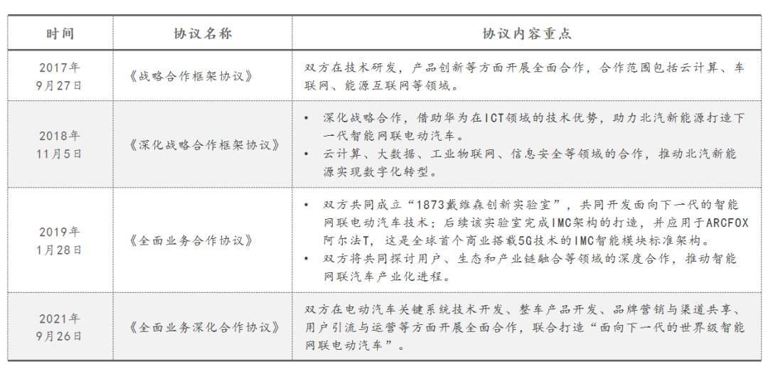2017年9月北汽和华为签署《战略合作协议框架》,北汽蓝谷(极狐运营主体公司)也是国内首家和华为基于HI模式合作的车企。随着华为和北汽合作的加深,2021年上市的极狐阿尔法S为全球首款搭载华为高阶自动驾驶技术的量产车型。