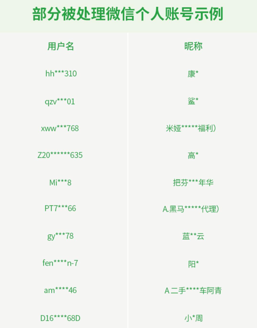 喏,微信可不是耍嘴皮子,这次可是来真的,还展示了部分被处理的微信个人账号。