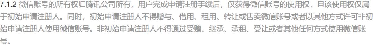 同时,初始申请注册人不得赠与、借用、租用、转让或售卖微信账号或者以其他方式许可非初始申请注册人使用微信账号。