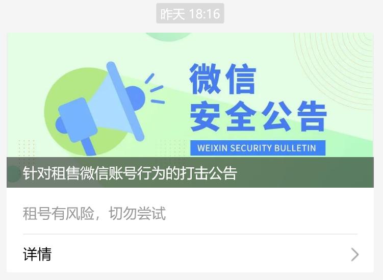 这不,昨天微信官方都坐不住喽,发布了《针对租售微信账号行为的打击公告》。
